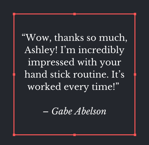 “Wow, thanks so much, Ashley! I’m incredibly impressed with your hand stick routine. It’s worked every time!” – Gabe Abelson