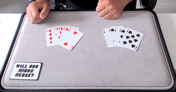 The performance begins with a prediction card stating, “Will Our Minds Merge.” The spectator is then invited to select a pile and spell out the phrase, starting with “Will.”